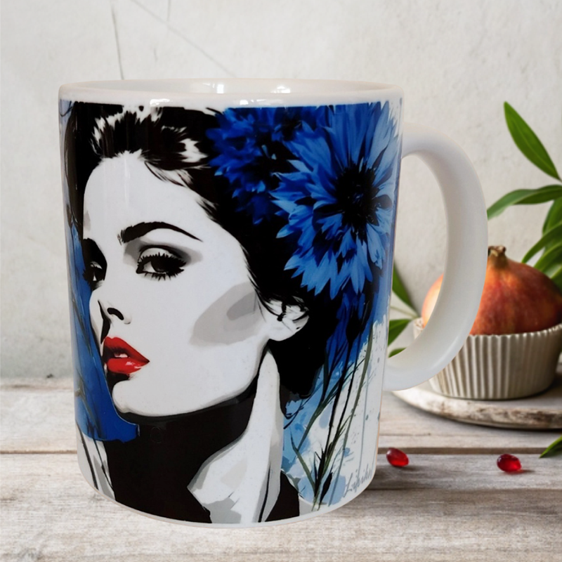 На кружке – фэшн-иллюстрация в духе работ Дэвида Даунтона, с акцентом на синий василек – символ 2025 года в Беларуси.