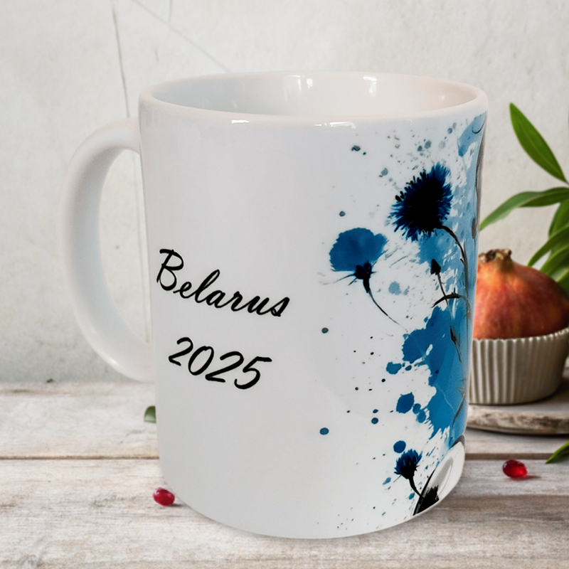 Каждая линия нарисована с лёгкостью и изяществом, а тонкие акварельные брызги придают образу воздушность и живость. Надпись «Belarus 2025» превращает эту кружку в особый сувенир, который всегда будет напоминать о годе василька.