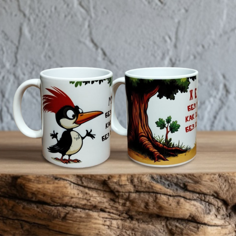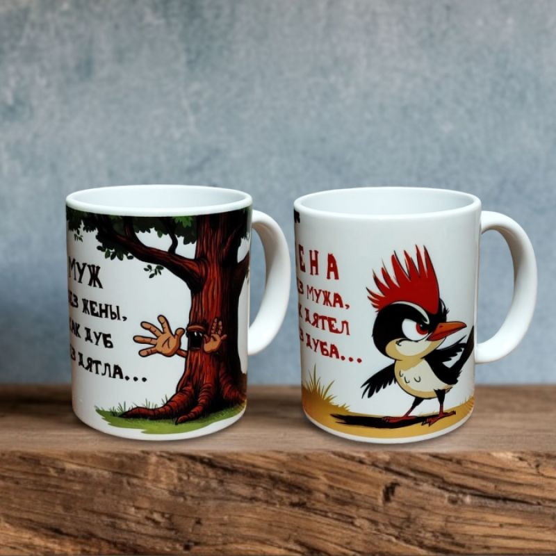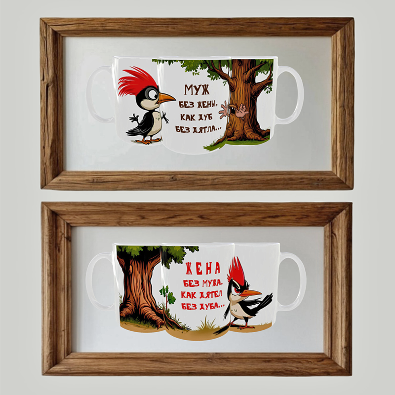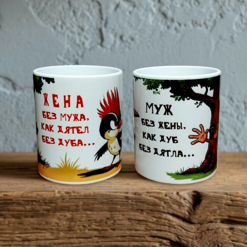 Эти кружки показывают мужа и жену через две их роли в отношениях: муж – воплощение спокойного и могучего дуба, жена – неугомонного и активного дятла. Красочные рисунки и юмористические надписи точно передают суть их взаимоотношений, подчеркивая не только юмор, но и глубокий смысл: взаимодополнение и заботу.