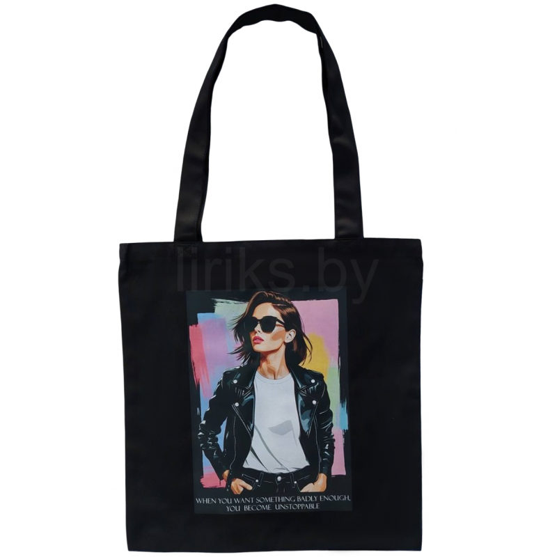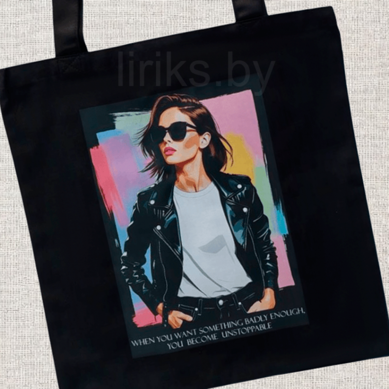На сумке привлекает внимание яркий графический принт в современном стиле с изображением стильной девушки в солнцезащитных очках и кожаной куртке. Выразительный образ дополнен красочными мазками и вдохновляющей надписью на английском языке «When you want something badly enough, you become unstoppable» (Когда ты по-настоящему сильно чего-то хочешь, тебя уже ничто не остановит). Сумка станет смелым и дерзким акцентом в вашем образе и отличным подарком для тех, кто ценит стиль, мотивацию и городскую эстетику.