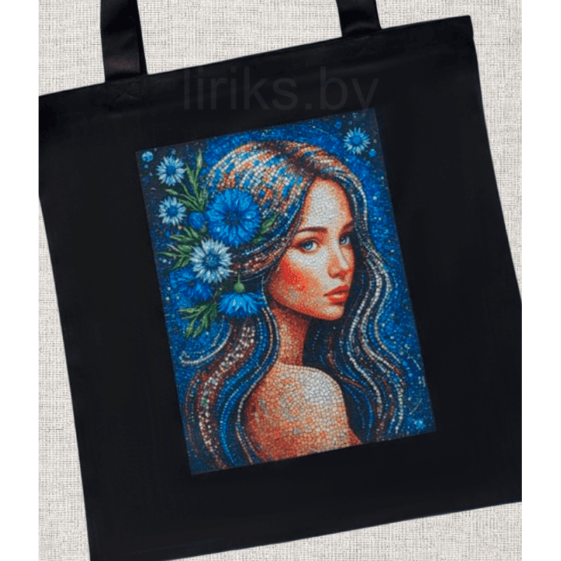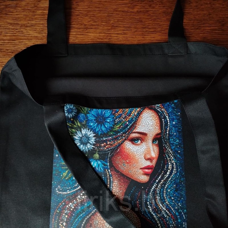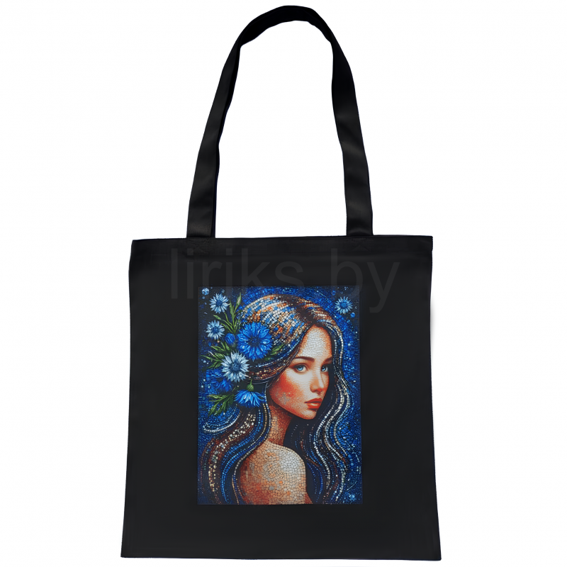 На сумке – портрет девушки, созданный в редкой технике, имитирующей мозаику. Мозаичный рисунок волос и васильки в волосах создает ощущение глубокой текстуры и игры света. Сумка станет ярким, артовым акцентом в вашем образе и отличным подарком для ценителей оригинальных аксессуаров.
