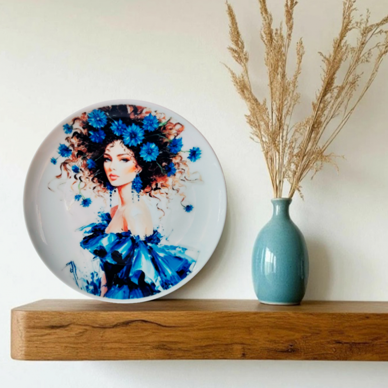 Декоративная тарелка с художественным изображением леди в синем с васильками, наполненным ощущением легкости и воздушности, станет ярким акцентом в интерьере и привлечет внимание своей художественной выразительностью.