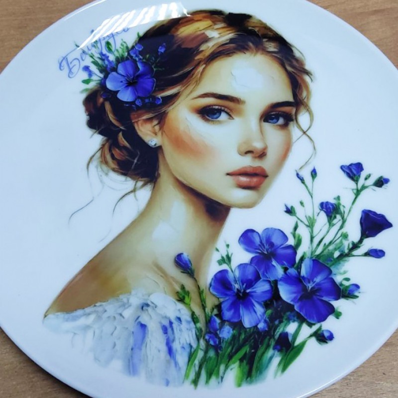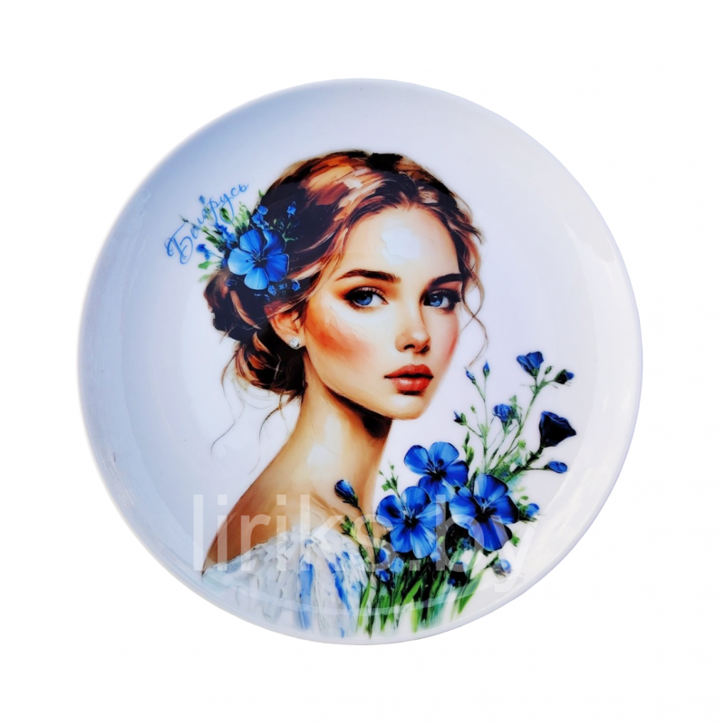 Декоративная тарелка с художественным портретом девушки с цветами льна - символом Беларуси станет ярким акцентом в интерьере. Изящная надпись "Беларусь" гармонично вписывается в художественный образ, подчеркивая его национальный колорит.
