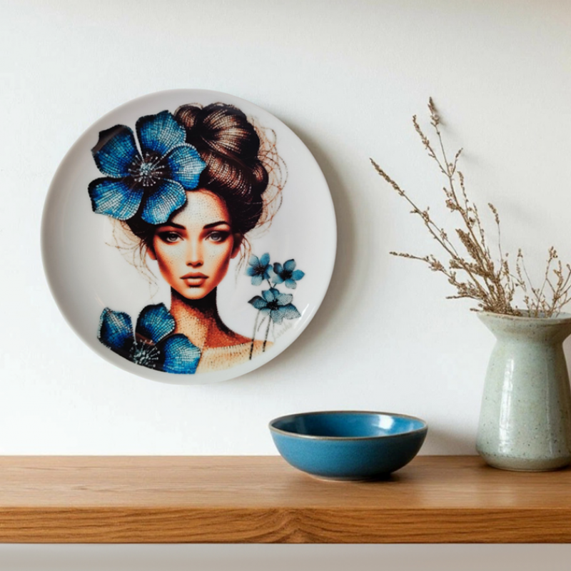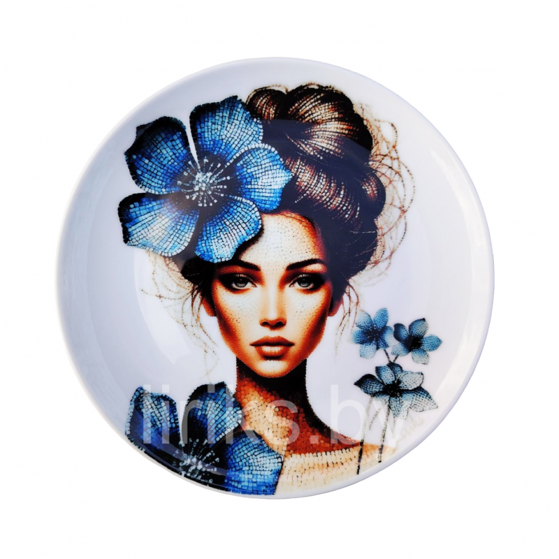 Декоративная тарелка, выполненная в необычной стилистике, с портретом леди с цветами льна - символами Беларуси - станет ярким акцентом в интерьере и привлечет внимание своей оригинальностью и художественной выразительностью.